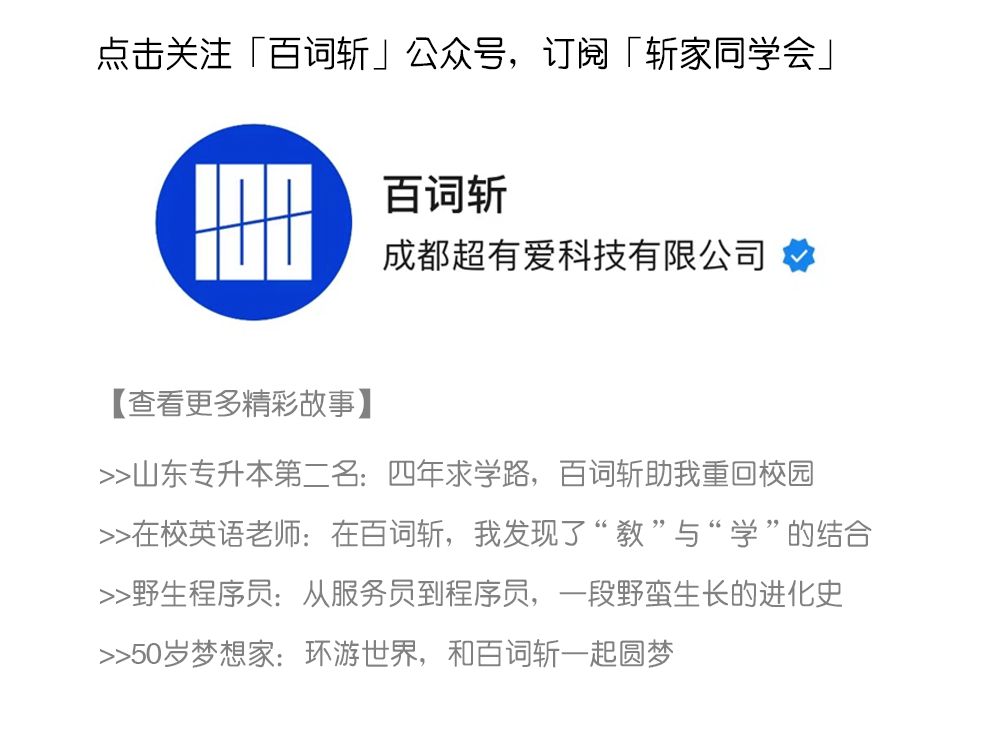 更多精彩故事请关注百词斩公众号-「斩家同学会」专栏~期待大家的留言和投稿,走心故事非常有机会登上「斩家同学会」专栏,让同行伙伴看到你的闪光故事吧✨